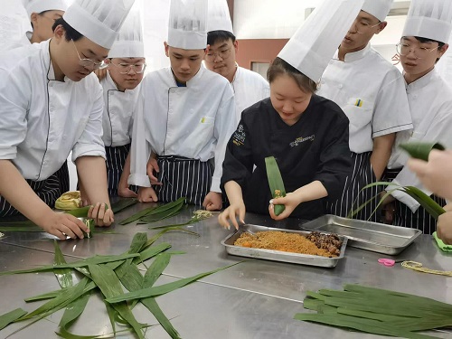 2022年5月31日,校團委組織新團員至學(xué)校烹飪實訓(xùn)室進行包粽子活動,學(xué)校董事長陳仕龍,副校長朱為群、唐亦紅,學(xué)工處主任陳宏以及團委副書記周穎參加了此次活動。烹飪老師胡林清組織學(xué)生學(xué)習(xí)了兩種粽子的制作方法,學(xué)生們從手忙腳亂到得心應(yīng)手,在實踐中繼承傳統(tǒng)、弘揚傳統(tǒng),增進愛黨、愛國、愛社會主義情感,增強文化自信,提升學(xué)生素養(yǎng)。