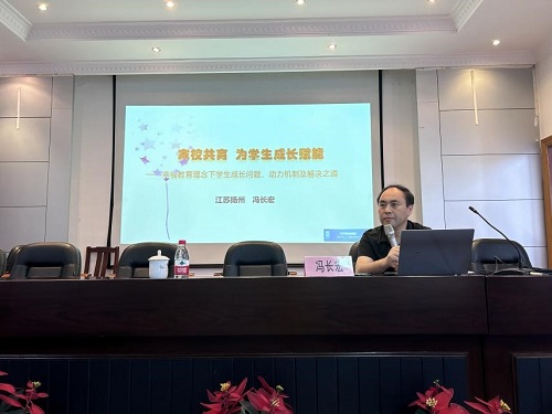8月28日,秋雨綿綿,涼風(fēng)習(xí)習(xí),卻擋不住我校教師學(xué)習(xí)的熱情。有幸邀請(qǐng)到中國(guó)教育學(xué)會(huì)班主任專委會(huì)副秘書(shū)長(zhǎng)、江蘇省特級(jí)教師、揚(yáng)州市邗江區(qū)教育局副局長(zhǎng)兼教師發(fā)展中心主任馮長(zhǎng)宏來(lái)我校做題為《家校共育 為學(xué)生成長(zhǎng)賦能——幸福教育理念下學(xué)生成長(zhǎng)問(wèn)題、動(dòng)力機(jī)制及解決之道》的精彩講座。在朱為群副校長(zhǎng)的主持下,在馮局長(zhǎng)的娓娓道來(lái)中,講座徐徐展開(kāi),在座的每位老師都沉浸其中。