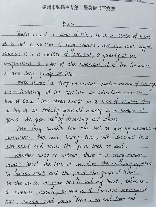 10月末,在期中考試即將來臨之際,我校英語組組織了第十屆英語書寫競賽。本次活動旨在通過比賽的形式激發(fā)學(xué)生學(xué)習(xí)英語的興趣,規(guī)范英語書寫并為高考寫作書寫打下堅實的基礎(chǔ)。高一高二年級各班經(jīng)過初選,最終每班選派兩名學(xué)生代表參加決賽。揚州市省特級,正高級教師謝平主任親臨現(xiàn)場,觀摩了學(xué)生比賽的全過程。