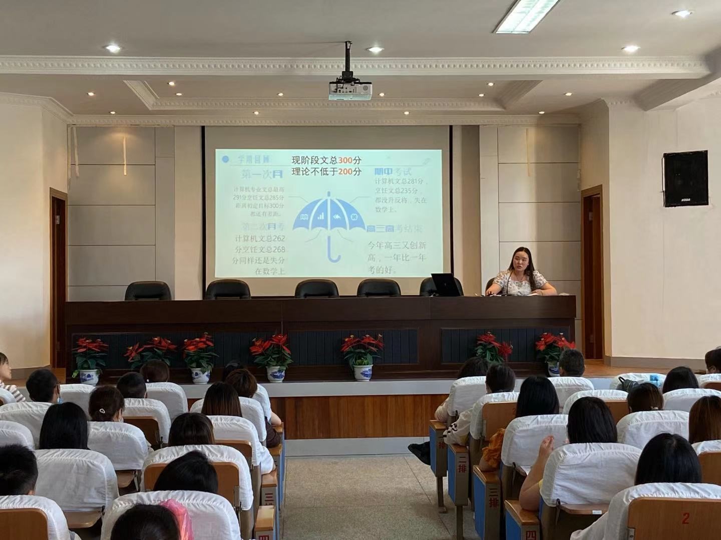 許振華老師首先對目前學(xué)習(xí)上存在的問題進(jìn)行分析,并給出解決和補(bǔ)救方案。許老師還對高二學(xué)生在這個年齡階段生理和心理發(fā)展中出現(xiàn)的變化進(jìn)行分析,她希望家長們在給予孩子尊重的同時,也要多做正確的引導(dǎo)。最后許老師參考近兩年的投檔線,結(jié)合目前同學(xué)們的成績,指出距離本科還存在一定差距。希望各位家長在回去后,能和孩子一起具體分析期中和月考的成績,找出問題,制定學(xué)習(xí)計劃,向著高考目標(biāo)努力努力再努力,讓我們的高考不留遺憾。