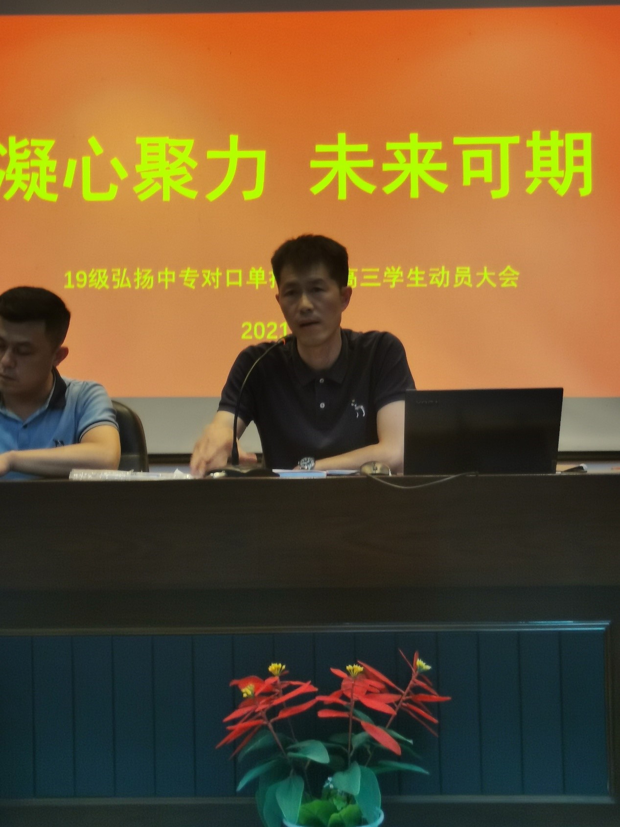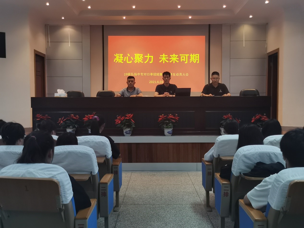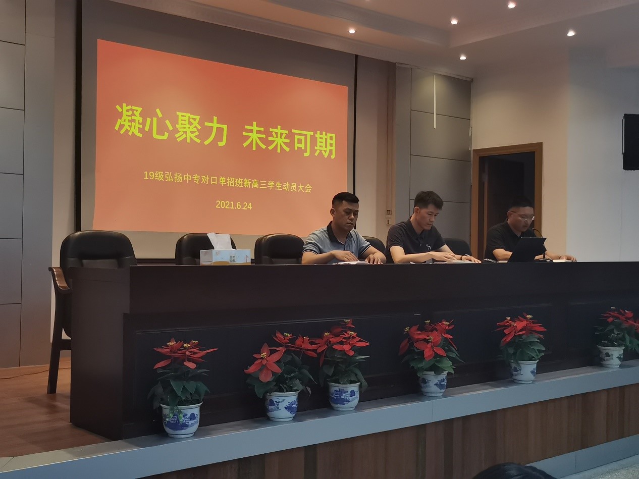6月24日晚,我校新高三年級對口單招班在綜合樓報告廳隆重舉行學生動員大會。分管校長唐亦紅、單招部主任王文佳和全體單招班班主任出席了會議,會議由年級組長李嚴主持。