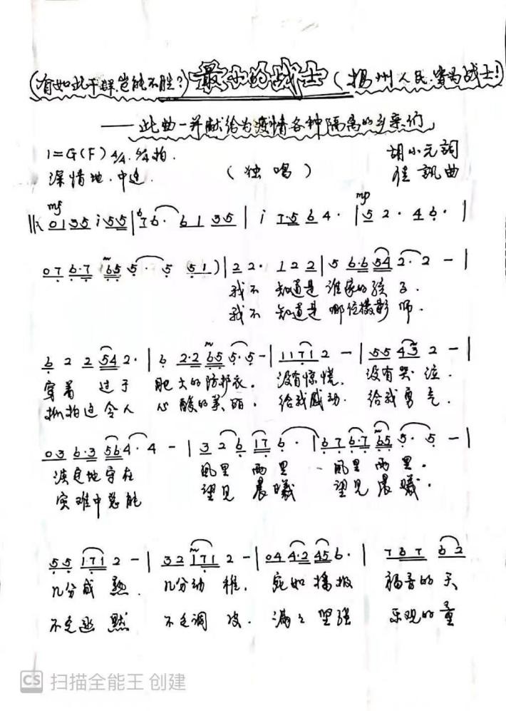 她說:“沒有報(bào)上志愿者,我內(nèi)心是失落的。想做點(diǎn)補(bǔ)救,于是就在家商量著創(chuàng)作了這首歌自己演唱,也算是為揚(yáng)州抗疫出點(diǎn)力,盡點(diǎn)心。胡小元老師這首描寫疫情下孩子的詞和網(wǎng)上“抗疫小戰(zhàn)士”的照片確實(shí)打動(dòng)了我,同時(shí)我也想到了自己的孩子,雖然手機(jī)錄音錄像效果不佳,但我的感情是真摯的。”