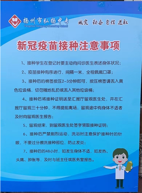 學(xué)校高度重視此次新冠疫苗接種工作,嚴(yán)格按照揚(yáng)州市邗江區(qū)衛(wèi)健委、疾控中心要求,提前制定工作方案,設(shè)計(jì)接種場(chǎng)地,部署接種流程,明確責(zé)任分工。學(xué)生工作組提前做好信息統(tǒng)計(jì)和部署工作,組織學(xué)生分批次有序接種。校內(nèi)各部門(mén)通力合作、認(rèn)真準(zhǔn)備、精心組織,為學(xué)生“足不出校”疫苗接種提供了堅(jiān)實(shí)保障。
